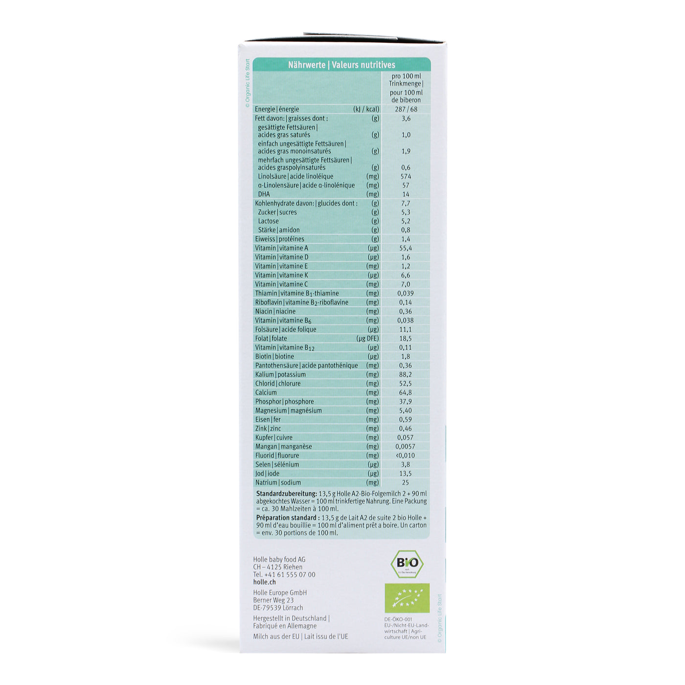 - Digestion and comfort. Holle A2 Stage 2 improves digestion for babies thanks to its gentle A2 protein. Organic oils and lactose promote easy absorption and reduce colic.