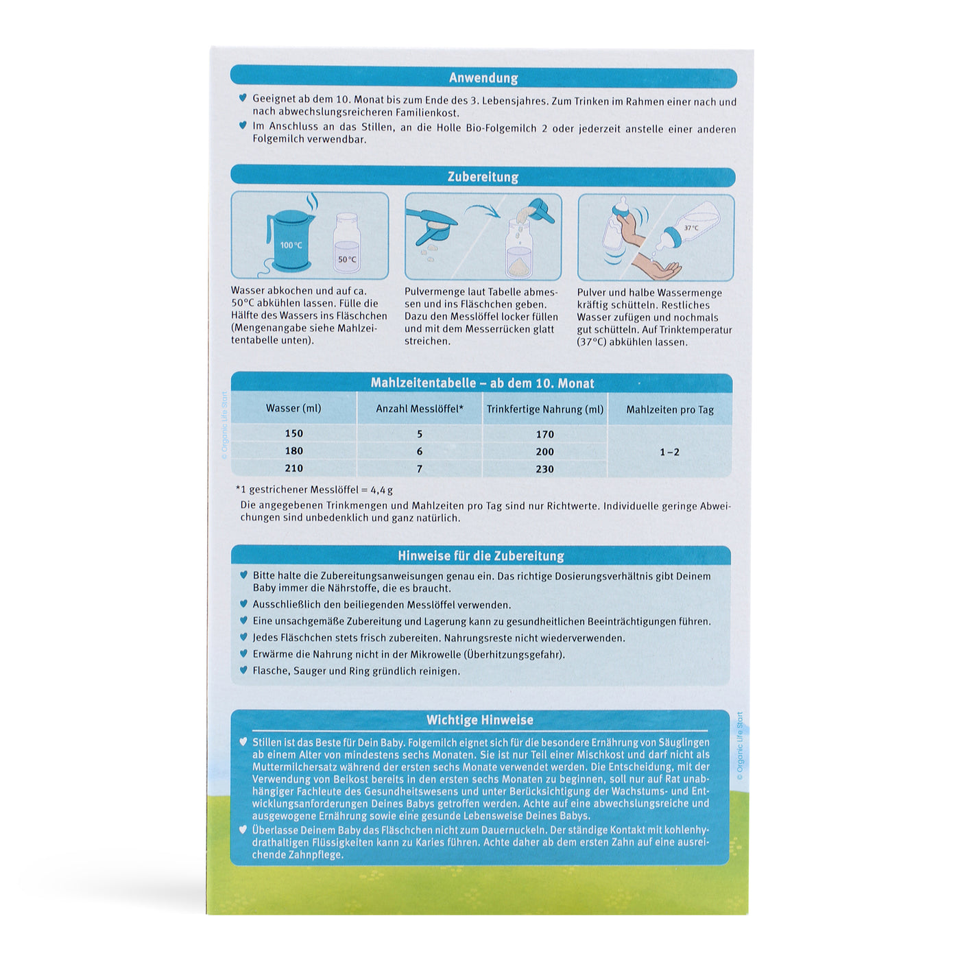- Step 5: Feeding Amounts. The box guidance provides the recommended daily amounts based on age. However, always consult with your pediatrician for advice on the exact water ratios, scoop size, and daily feeding amounts. Never add extra Holle Bio formula scoops of powder, as this can be dangerous for your baby.